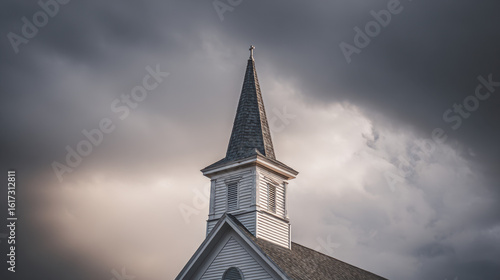 Fototapeta premium White church steeple against a dramatic sky.