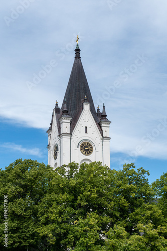 © Magnus, Fototapeta premium White church tower against a blue and white sky
