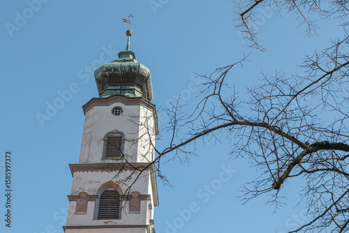 © vip-photoworld, Fototapeta premium White church tower with a dome on top in Lindau, Germany An iron flag hangs on top On the right in the photo you can see a tree without leaves