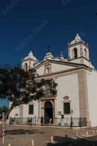 Fototapeta premium White church with twin bell towers in Algarve under clear blue sky