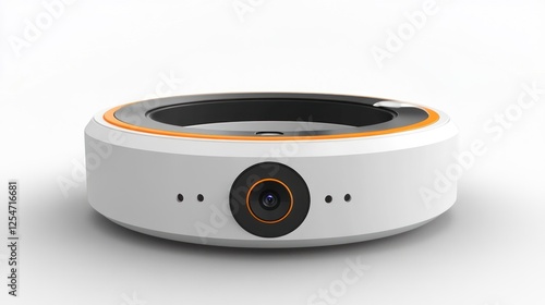 © Almahyra, Fototapeta premium White circular webcam with orange accents on white background.