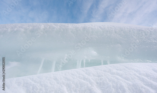 Fototapeta premium White clean snowdrifts and icicles close-up. Pile of snow