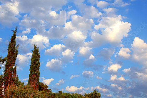 © donyanedomam, Obraz premium White clouds above the hill in Korcula town, Croatia