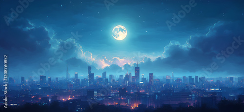 Fototapeta premium White clouds, moonlight shining on the city skyline, night sky, urban buildings