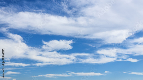Obraz premium White clouds on blue dramatic sky Sunbeam, background look abstract nature.