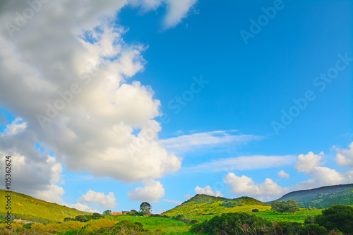 © Gabriele Maltinti, Obraz premium white clouds over a green landscape
