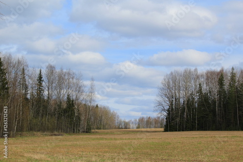 © алексей семиколенных, Obraz premium white clouds over field and forest in mid spring