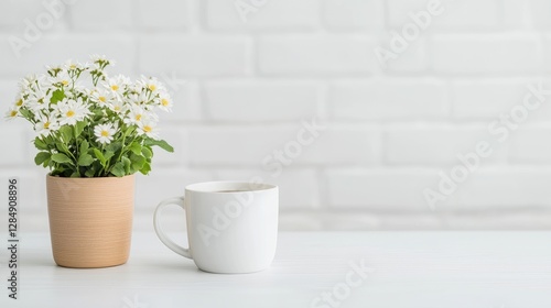 Fototapeta premium White coffee cup and flowers on white table near white brick wall. Possible...