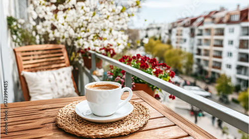 © Bonsales, Naklejka premium White coffee cup on a wooden table, enjoying a spring morning on a balcony with city buildings and blooming trees in the background