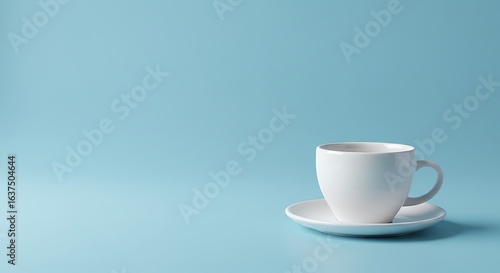 © Budi, Obraz premium White Coffee Cup on Saucer with Blue Background for Morning Drink Concept