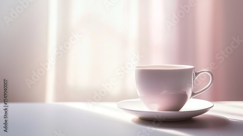 Fototapeta premium White coffee cup on saucer with pastel background and soft morning lighting...