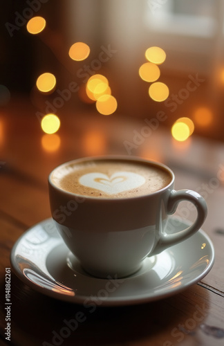 © Natalia, Fototapeta premium White coffee cup on wooden table on blurred background