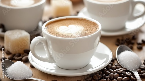 © Postmodern Studio, Obraz premium White coffee cup with a heart on it sits on a wooden table with sugar