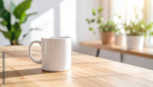 Obraz premium White Coffee Mug on a Wooden Table with Plants in the Background