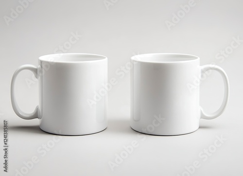 © Fathor, Obraz premium 2 white coffee mugs mockup, plain background, front view, no text or design on the mugs, high resolution, professional photograph, studio lighting, sharp focus, highly detailed.