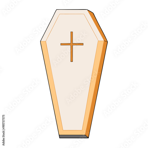© f., Obraz premium White coffin with a cross illustration on beige background, Halloween concept