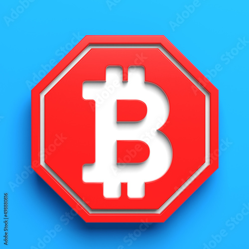 © MicrostockFactory, Obraz premium White-colored Bitcoin Symbol and red-colored stop sign. On blue-colored background. Square composition with copy space. Isolated with clipping path.