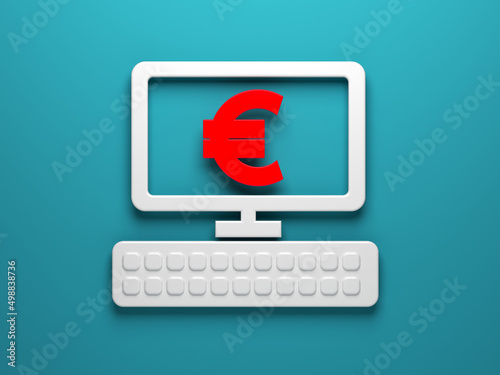 Obraz premium White-colored computer icon and euro symbol. On the grayish blue-colored background. Horizontal composition isolated with clipping path.