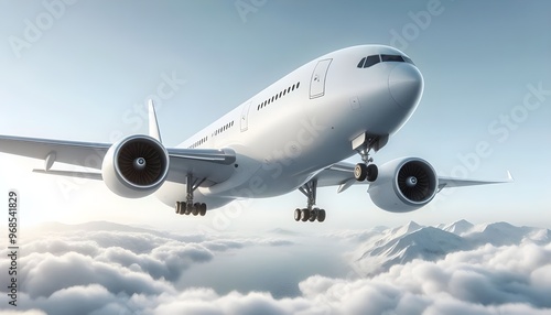 © QasimAli, Obraz premium White commercial airplane in dynamic ascent isolated on white, travel concept. 3D Rendering