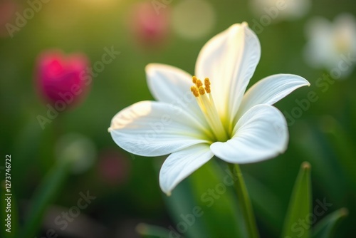 © Kingphet, Fototapeta premium White corolla flower with visible yellow stamens on a green stem, garden, spring