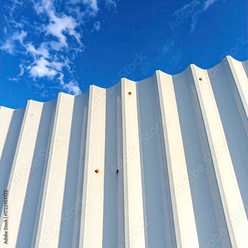 © Lumo, Obraz premium White corrugated metal wall against a vivid blue sky with scattered clouds