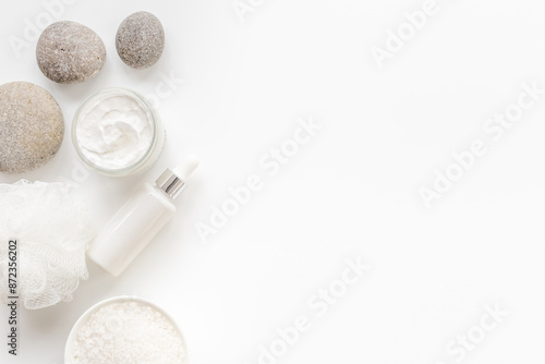 Fototapeta premium White cosmetics products with stones and white roses