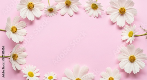 © Ikwan, Fototapeta premium White cosmos flowers frame on pink background floral design spring summer wedding invitation template 100char
