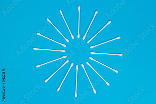 Obraz premium White cotton swabs on blue background.