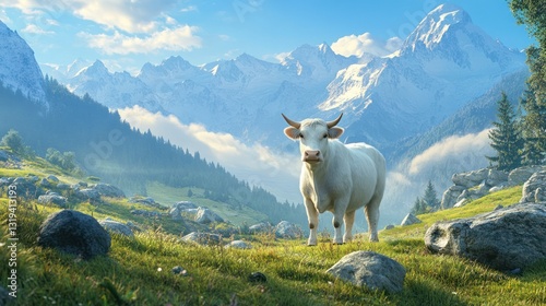 Fototapeta premium White cow in alpine meadow, mountain backdrop, sunny day, tranquil scene,...