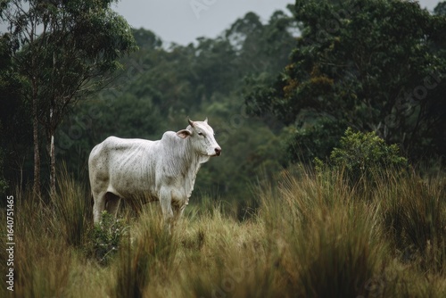 Obraz premium White cow in lush, green forest