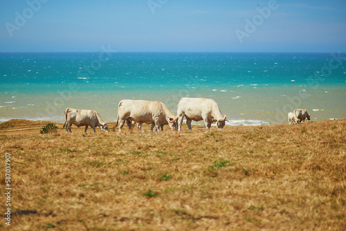 © Ekaterina Pokrovsky, Fototapeta premium White cows grazing on a green pasture near the Atlantic coast in France