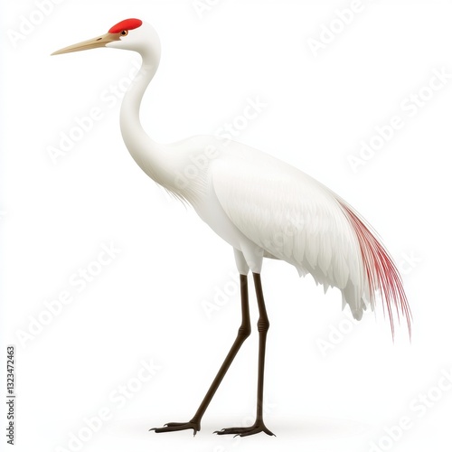 © A4719, Fototapeta premium White crane with red crown and tail feathers against a white background. Detailed illustration of a bird.