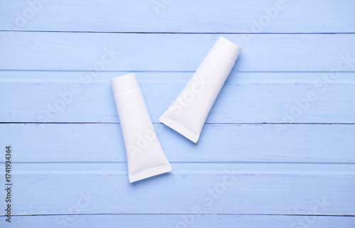 © splitov27, Fototapeta premium White cream tubes on blue wooden background. Template for design. Beauty concept