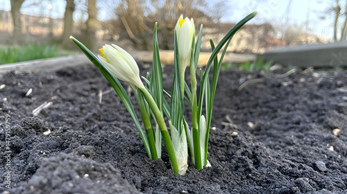 © Isra, Fototapeta premium White Crocus Blooms in Spring Soil