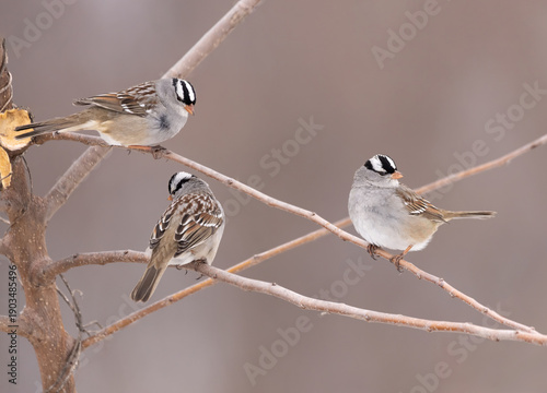 © Hal Moran, Naklejka premium White-crowned sparrows on stem in open field