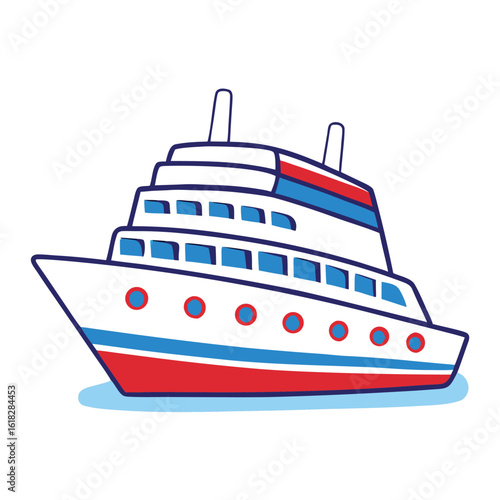 © Sneha, Obraz premium White cruise ship with blue windows and red accents boat water