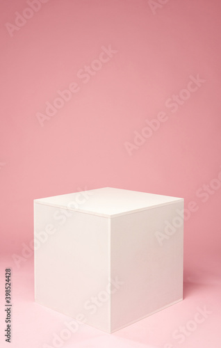 Obraz premium White cube on the pink background. White platform for objects.