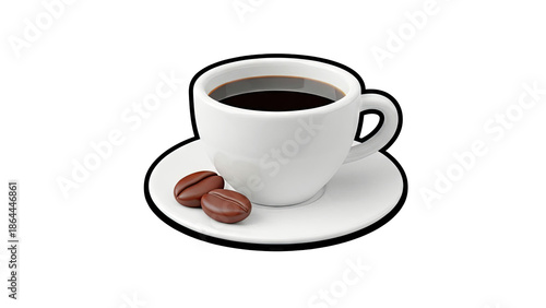 © melani, Obraz premium White cup of black coffee with coffee beans on saucer