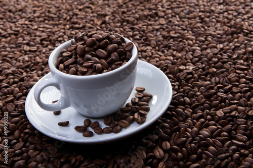 Fototapeta premium white cup of coffee at coffee beans backgrounds