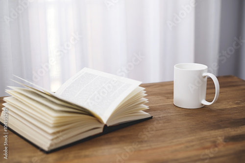 © Freestocker, Naklejka premium White cup of coffee with a book on wooden table.