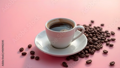 © Anastasiia Bublyk, Fototapeta premium white cup of coffee with beans on pink background