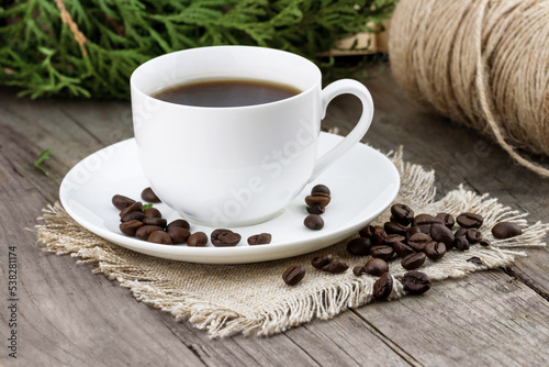 Fototapeta premium White cup of coffee with roasted coffee beans