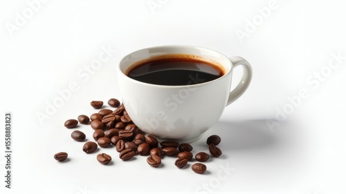 Fototapeta premium White Cup with Espresso and Scattered Coffee Beans on Clean Background - Fresh Morning Energy Concept