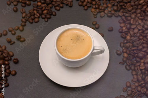 Obraz premium white cup with espresso coffee on a saucer with coffee beans on a dark...
