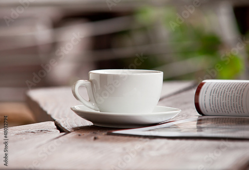 © Soloviova Liudmyla, Fototapeta premium White cup with magazine on the wood table
