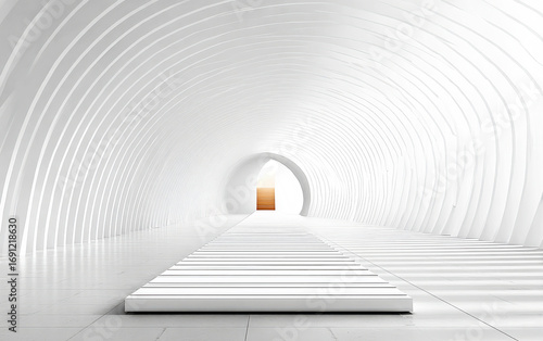 © fanjianhua, Obraz premium White curved tunnel with a bright end showing modern architecture