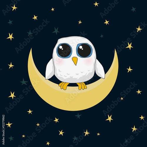 © satika, Obraz premium white cute owl are sitting on the moon at night