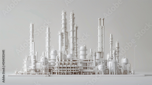 © Mutshino_Artwork, Obraz premium White 3D model of an industrial oil refinery with complex pipes and structures in a minimalistic setting