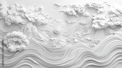 © nangruthai, Obraz premium White 3D Papercut Landscape Mountains Clouds Waves