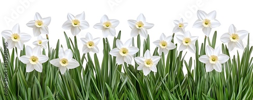 © Asrianto, Fototapeta premium White daffodils bloom in a garden, isolated on white for a fresh spring floral design